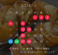 新屋ガラス工房カフェの2026年1月カレンダーはこちら。コーヒードリップワークショップや季節の素材を使った週替わりのパスタなどカフェの情報はイ...
